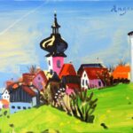 Regardless of norms and general sense of style, Peter Angermann (* 1945) creates fascinating landscapes that cannot be assigned to any specific art genre. The artist depicts the town of Thurndorf in the colorful, idyllic painting “Thurndorf Zwiebel” from 2016, which visualizes the center of the village as well as the love of nature and the affection of the artist for his hometown. ET