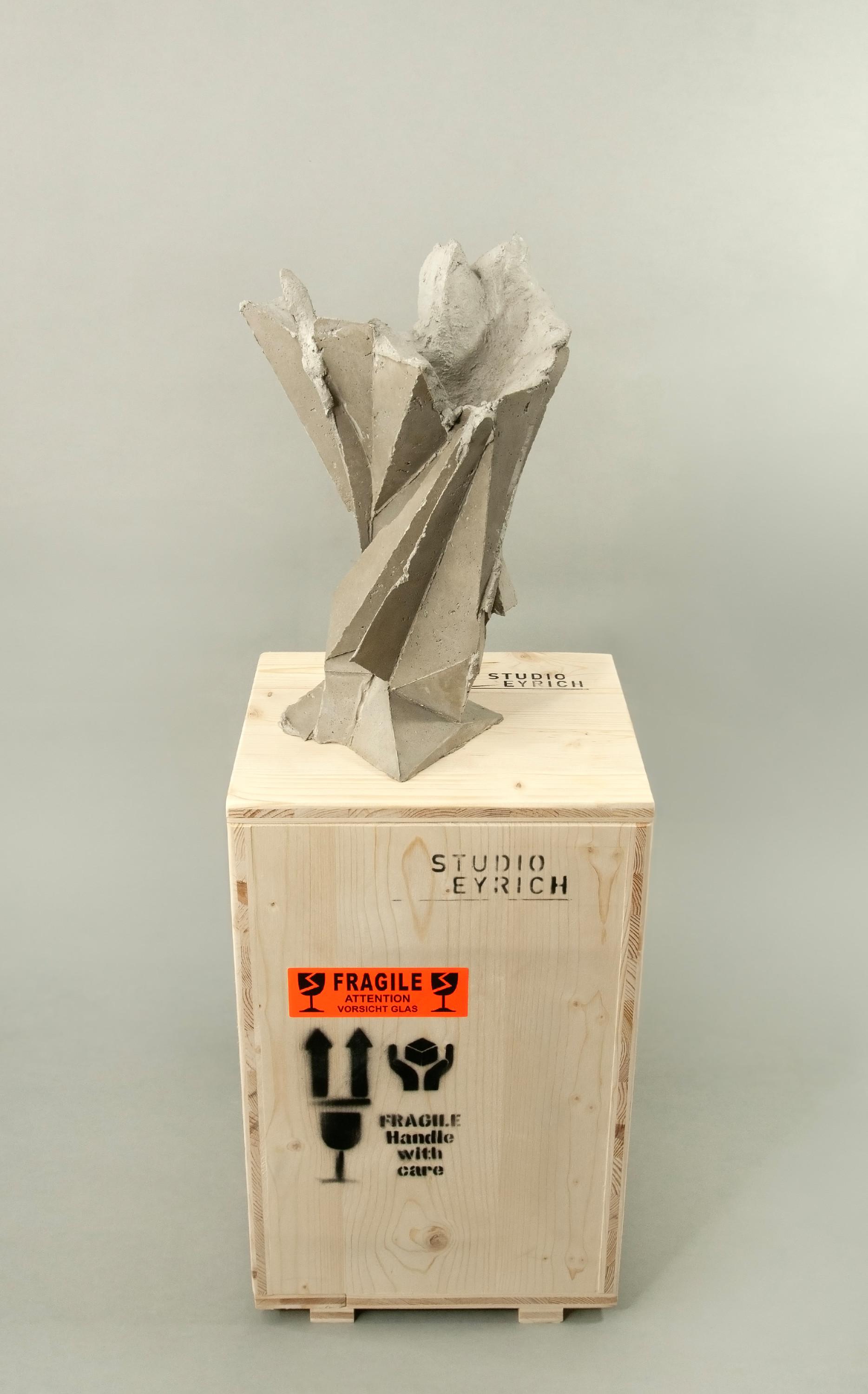 The wooden crate, designed by the artist, functions both as secure transport packaging for the concrete sculpture and as a display pedestal.