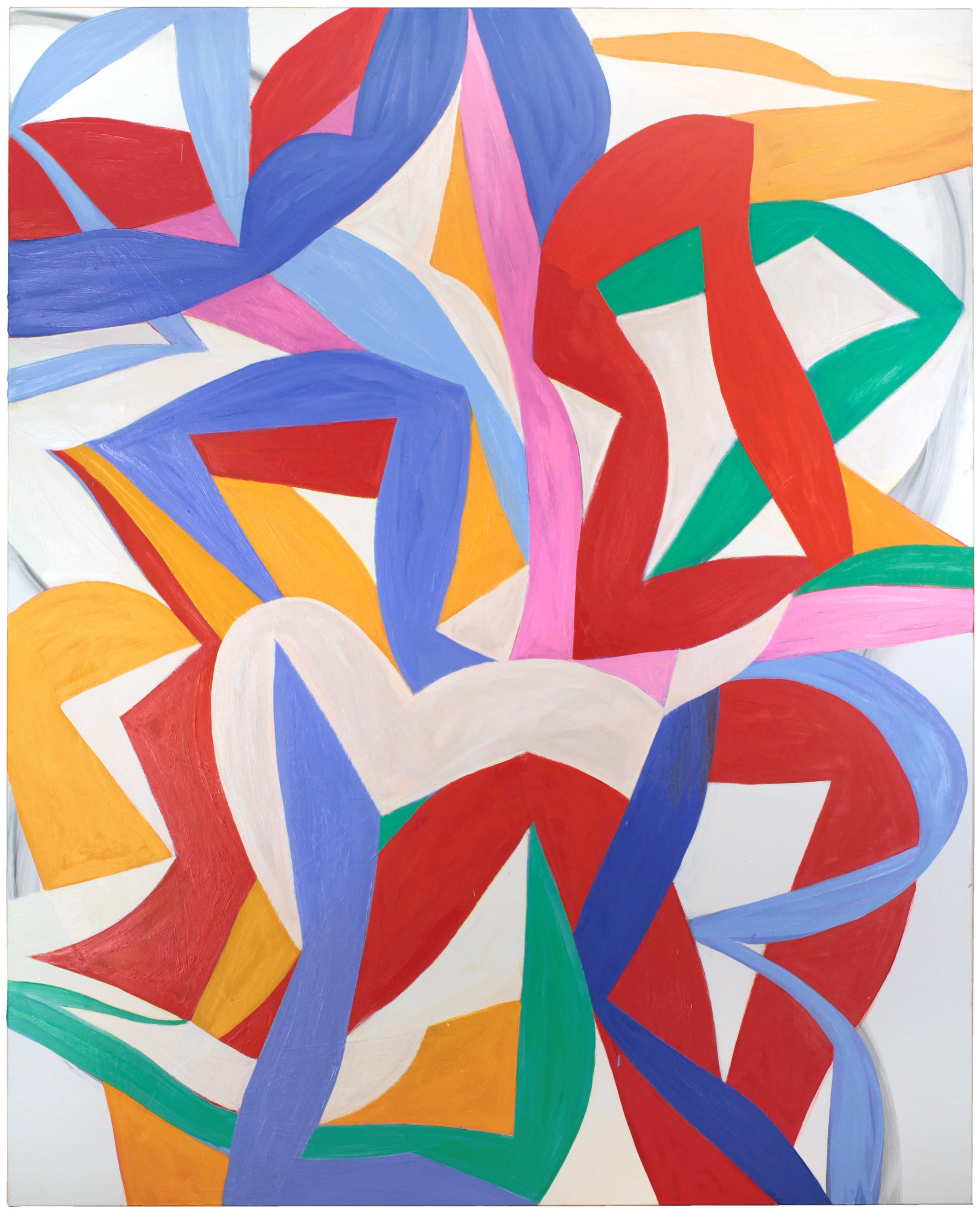 In der vorliegenden Arbeit entfaltet sich ein dynamisches Geflecht aus kraftvollen, geschwungenen Formen. Die leuchtenden Primär- und Sekundärfarben – Rot, Blau, Gelb und Grün – stehen in lebendiger Beziehung zueinander und erzeugen eine vibrierende Spannung, die zugleich harmonisch wirkt. Die Linien scheinen sich zu verschlingen, zu drehen und wieder freizugeben – wie Figuren in einer Choreografie.
