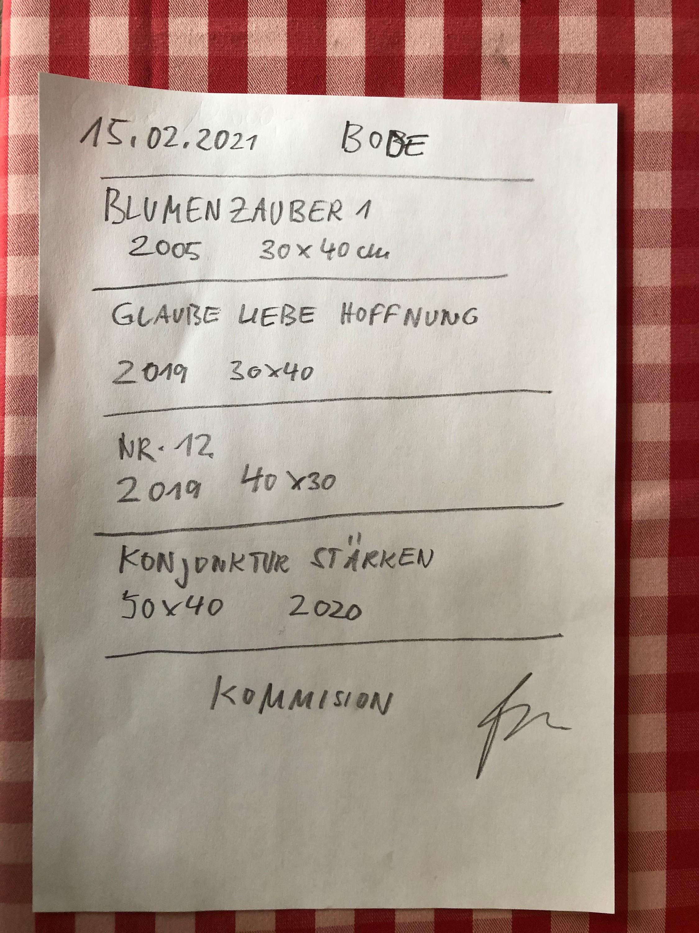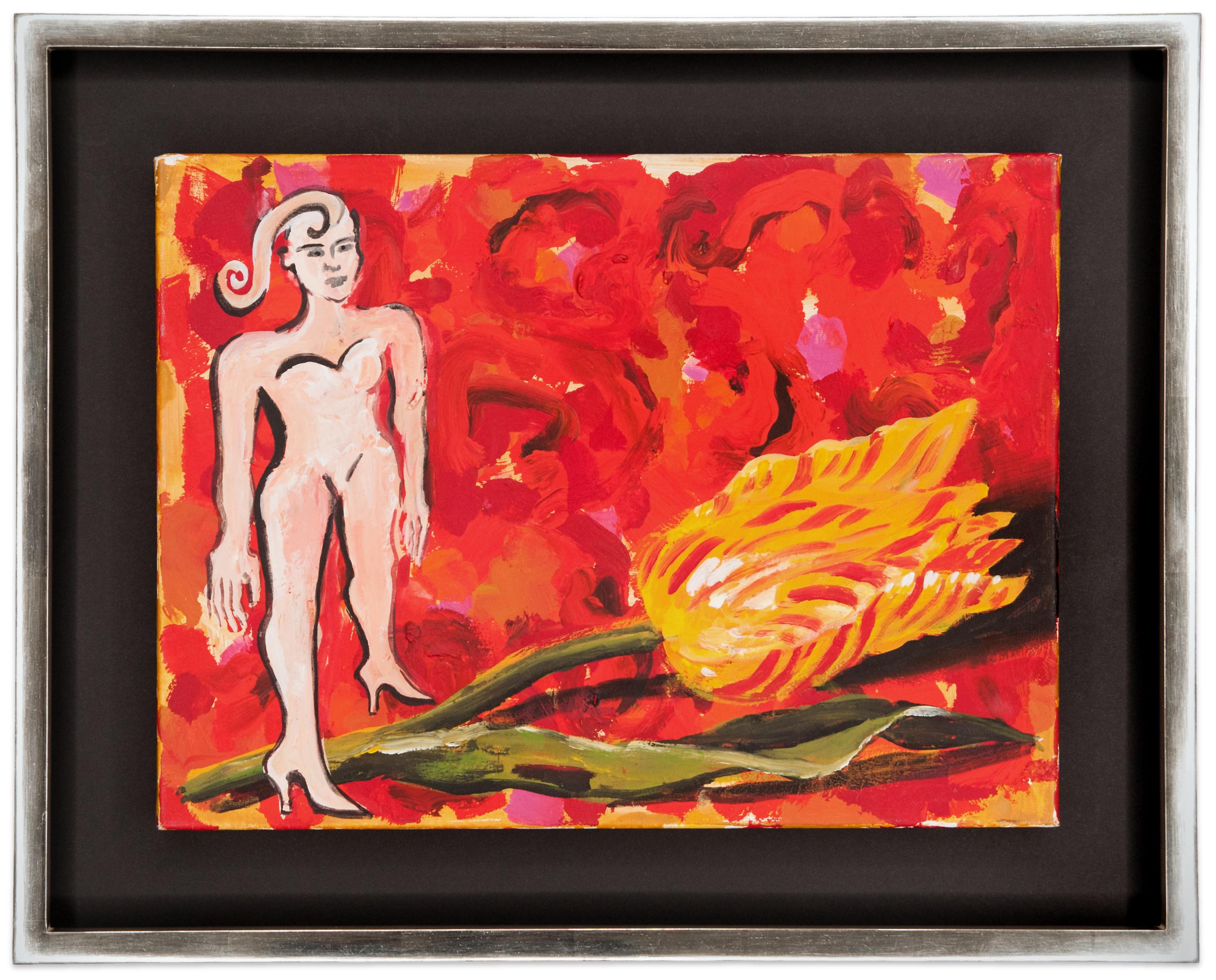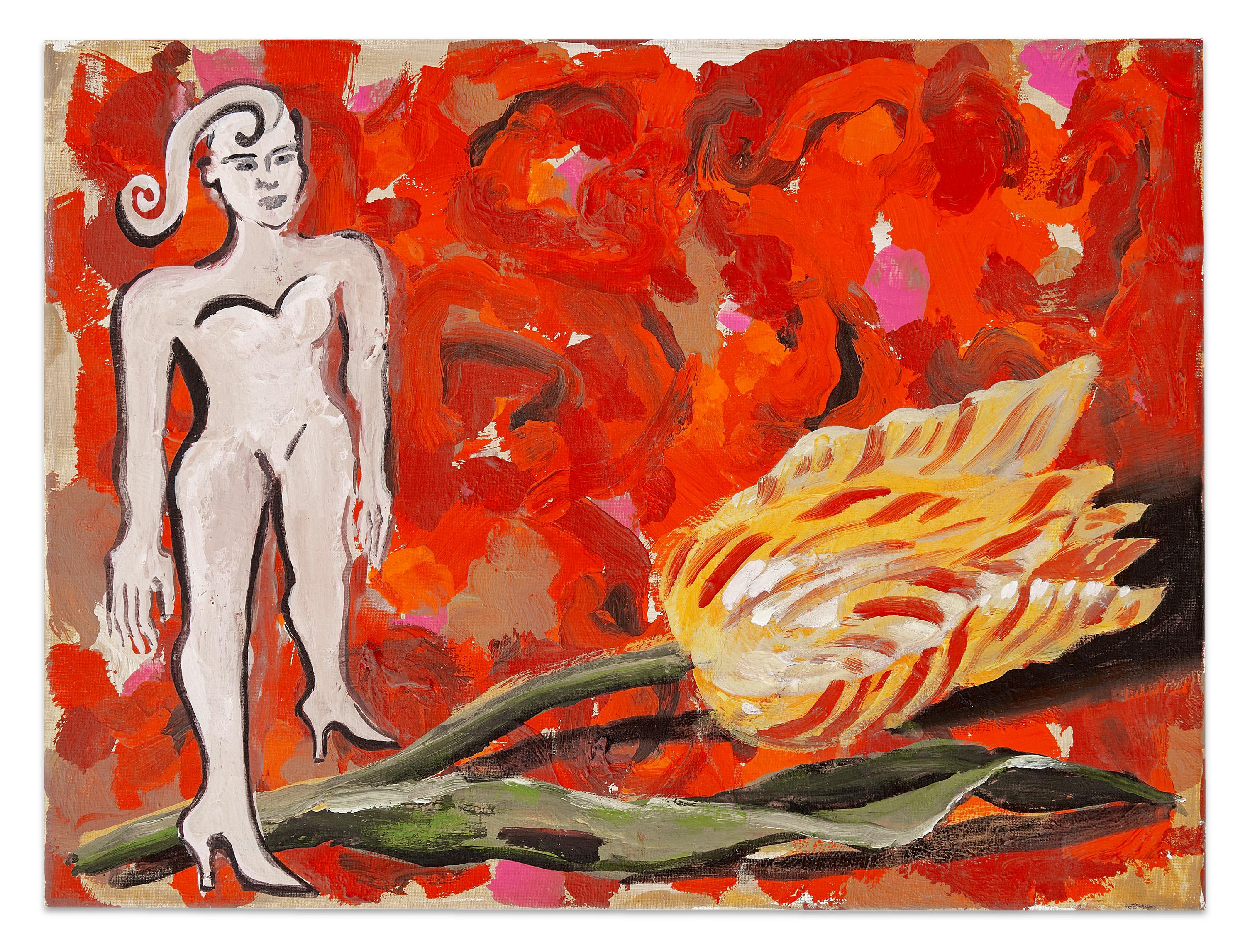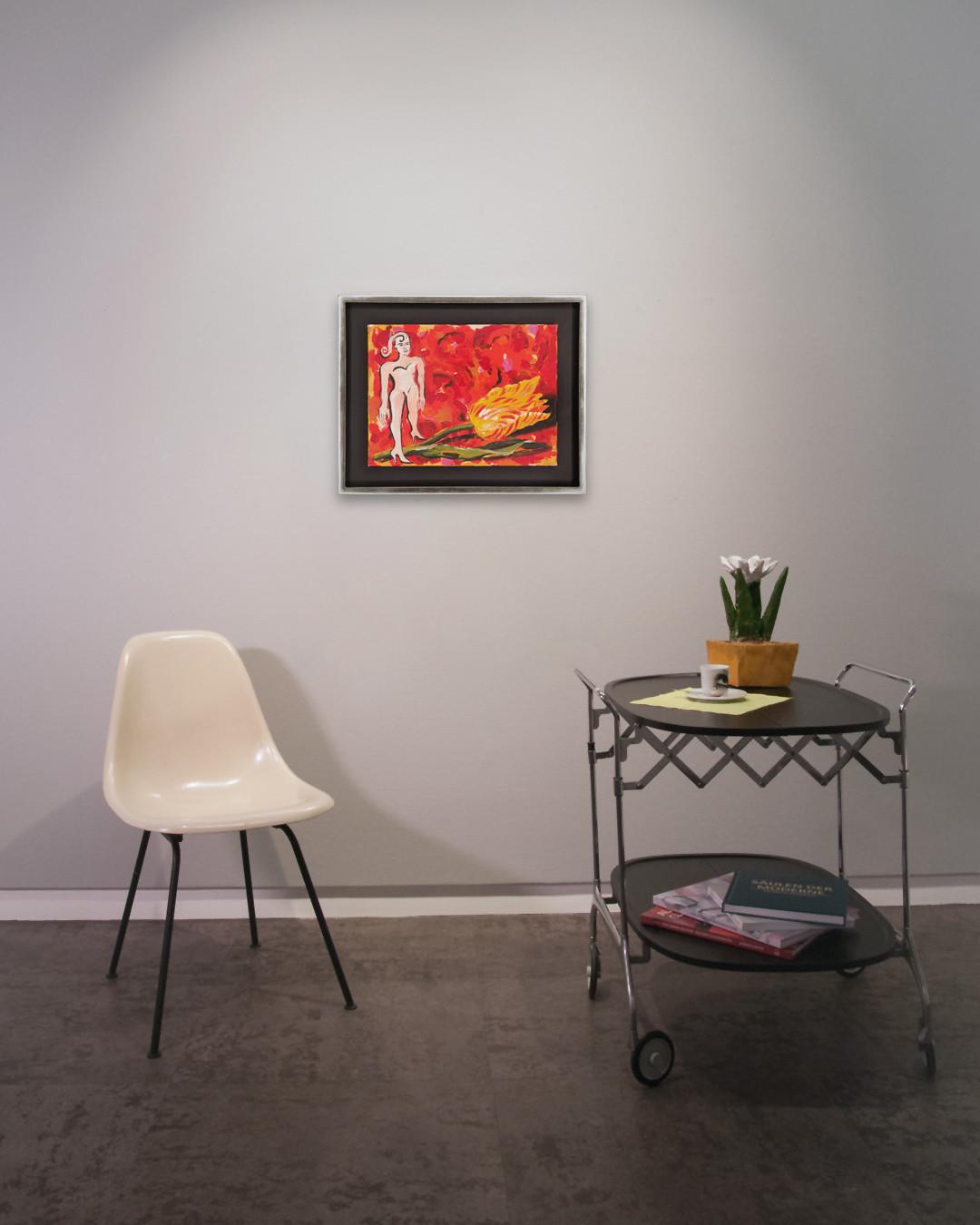 Das Gemälde „Blumenzauber“ von Elvira Bach interpretiert auf einzigartige Weise die Verbindung zwischen einer starken Frau und dem Symbol der Blume. Hier wird die Blume nicht nur als Schmuck oder Kommunikationsmittel dargestellt – die Figur erhebt sich über dieses klassische Attribut und behält ihre eigene Deutungshoheit.