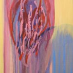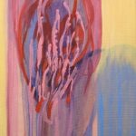 In „Finnwal Affection VI“ verdichtet sich die Energie. Ein intensiver, kreisförmig gefasster Binnenraum in Rot- und Rosétönen bildet das pulsierende Zentrum der Komposition. Umgeben von weich verlaufenden Gelb- und Blauschleiern entsteht ein Spannungsfeld zwischen Umhüllung und Öffnung.