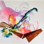 In dieser Arbeit verdichtet Donata Benker ihre Auseinandersetzung mit räumlicher Ordnung zu einem offenen, prozesshaften Gefüge. Transparente Farbschichten überlagern sich wie atmosphärische Zonen. Rosa, Türkis und leuchtende Gelbpartien erzeugen ein pulsierendes Innenklima, das zwischen Weite und Verdichtung oszilliert.