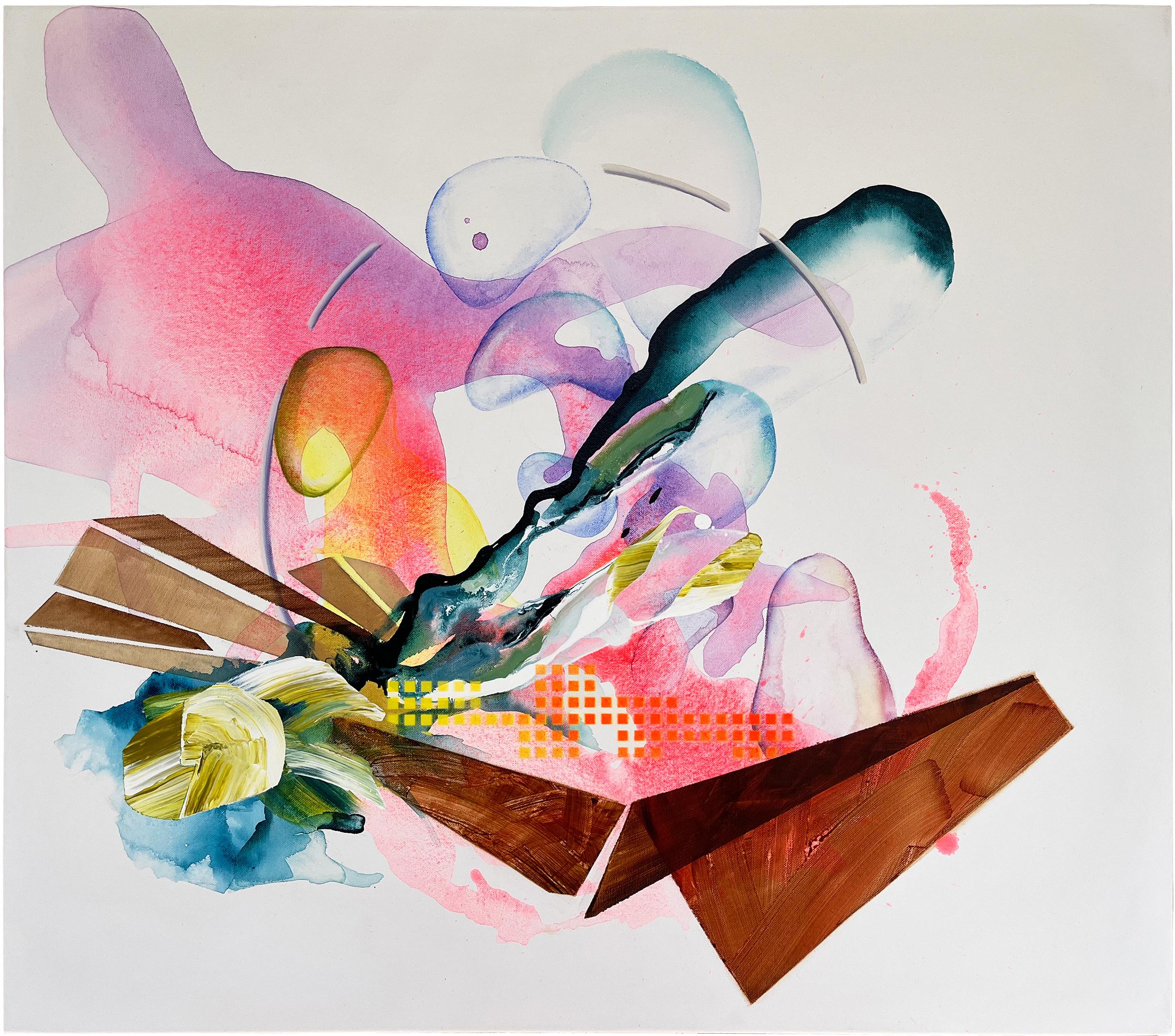 Holzartig anmutende, kantige Formelemente durchschneiden den Bildraum diagonal. Sie wirken konstruktiv, beinahe architektonisch, verlieren jedoch durch ihre Setzung im offenen Weiß des Hintergrundes an statischer Eindeutigkeit. Linienfragmente, Raster und weich verlaufende Farbwolken verbinden sich zu einer Topografie im Übergang – weder eindeutig gebaut noch vollständig entgrenzt.