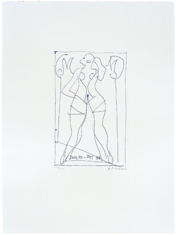 Die 1970 bei der Manus-Presse in Stuttgart erschienene Graphik aus Richard Lindners Serie „Marily was here“ zeigt eine reduzierte, fast schwebende Linienzeichnung, in der die Silhouette einer weiblichen Figur nur angedeutet erscheint. Geometrische Formen und diagrammartige Strukturen flankieren die Figur und erzeugen einen spannungsvollen Kontrast zwischen organischer Präsenz und technischer Abstraktion. Ohne ein direktes Porträt anzulegen, reflektiert Lindner den Mythos Marilyn Monroe als kulturelles Zeichen: fragile Erscheinung und zugleich konstruierte Ikone. Die zarte Bleistiftführung und die großzügige Leere des Blattes verleihen der Komposition eine poetische Zurückhaltung, die den Blick auf die symbolische Dimension des Motivs lenkt.