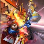 In dieser Komposition tritt die menschliche Figur als zentrales Moment in Erscheinung. Der Körper ist gekippt, verschränkt mit architektonischen Splittern, Lichtfeldern und dynamischen Farbbahnen. Er ist weder ruhender Mittelpunkt noch isoliertes Motiv, sondern Teil eines energetischen Gefüges.